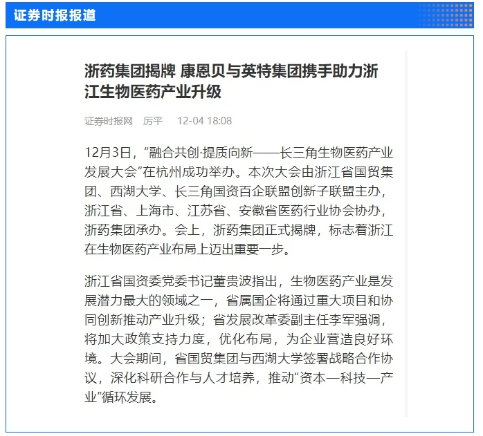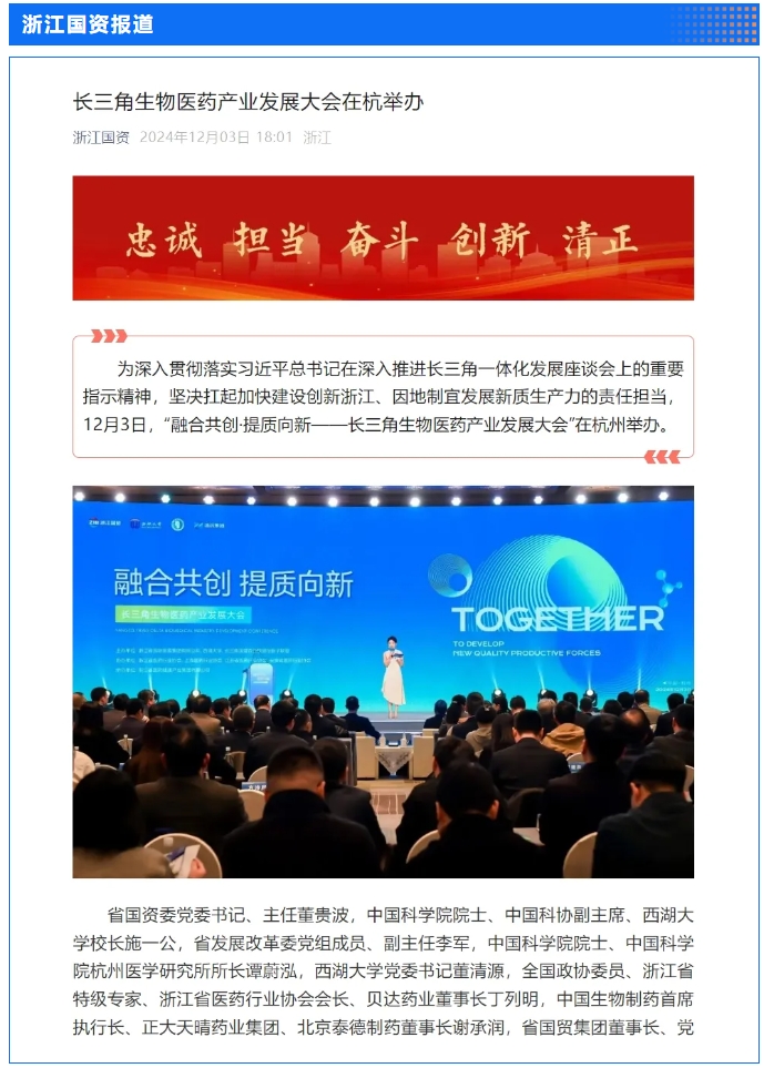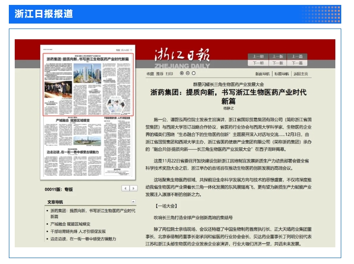 12月3日,省國貿集團和西湖大學主辦,集團下屬浙藥集團承辦的“融合共創·提質向新——長三角生物醫藥產業發展大會”在杭州圓滿舉行,會上,行業專家和企業家聚焦前沿生命科學的發展趨勢與技術革新,共同探討如何構建長三角生物醫藥一體化發展新格局。浙江日報專版深度聚焦會議情況,中新社、央視網、證券時報、浙江在線、浙江國資、浙商雜志、杭州日報等多家媒體對會議進行了報道。